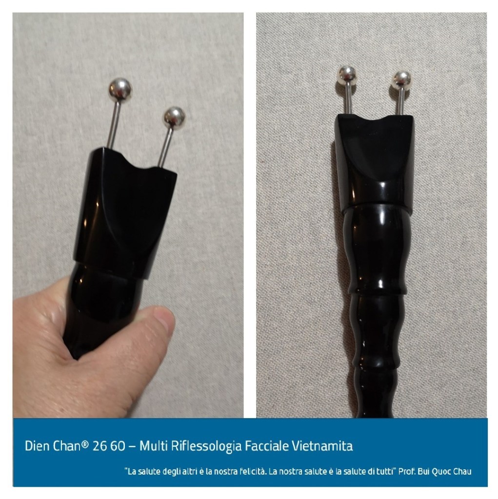 Questo è uno dei miei attrezzi Dien Chan chiamato “Scorpione”, con due sfere in argento, creato dai Vietnamiti, ha una forma molto comoda, infatti permette di tenere “lo scorpione” saldamente nelle mani. L’attrezzo è utile per trattare le zone riflesse più grandi. Il manico in corno di bue può essere usato per riscaldare il corpo con stimolazione Yang, mentre le sfere in argento possono essere usate sui punti BQC del viso o sulle zone riflesse Dien Chan per disintossicare; è molto efficace passare questo attrezzo ai lati della colonna vertebrale per alleviare il mal di schiena, ma anche delicatamente sul collo, sulle spalle, braccia, gambe ed altre zone.